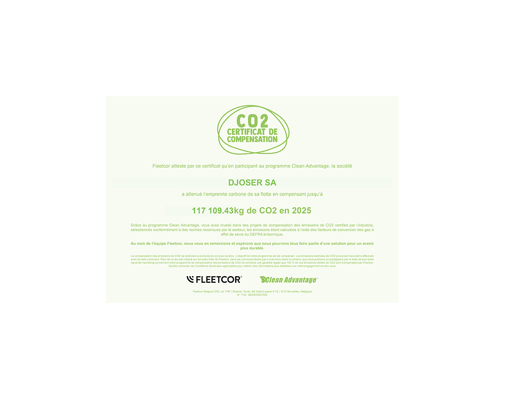 En obtenant une nouvelle fois notre certificat de compensation CO₂, DJOSER SA confirme son engagement dans la durée.